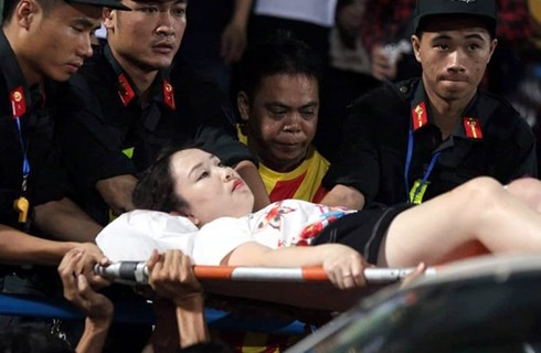 Nữ cổ động viên CLB Hà Nội bị trúng pháo sáng, bị thương phải nhập viện. |
