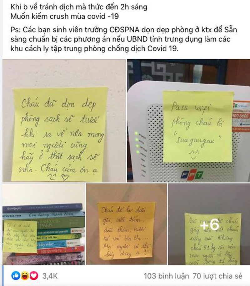 Tại khu ký túc xá của Trường cao đẳng Sư phạm Nghệ An những mẩu giấy nhắn màu vàng được dán khắp nơi trước khi các sinh viên rồng rắn vận chuyển đồ đạc đi ở nơi khác, nhường chỗ cho những người đến cách ly phòng dịch. Đó là những dòng tin nhắn dù ngắn ngủi nhưng là lời động viên và chia sẻ đầy tình cảm với những người phải cách ly.
