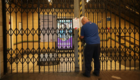 Một nhân viên đóng cửa trạm tàu điện ngầmBarbican, khi giao thông công cộng ở London bị hạn chế |