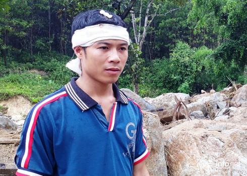"Vẫn chưa định thần được là gì thì tôi đã bị cây cối, đất đá dìm xuống. Khi cố gắng đạp lên thì may mắn ôm được cây cột, rồi trèo lên trên ôm chặt để cho nó trôi tự do. Cũng nhờ chiếc đèn pin treo trên đầu, tôi phát hiện vợ con kêu cứu, định lao xuống cứu nhưng không kịp", anh Dũng đau đớn kể lại.