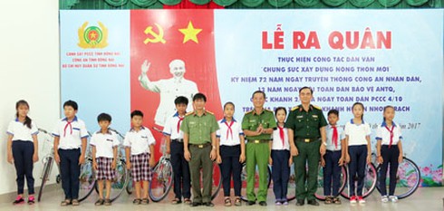 Lực lượng công tác đã khởi công xây dựng 3 căn nhà tình thương để tặng đối tượng khó khăn chưa có nhà ở với kinh phí 50 triệu đồng/căn; khám bệnh, cấp thuốc miễn phí cho trên 500 người và đối tượng chính sách; thăm và tặng quà cho 3 cơ sở tôn giáo; tặng 10 xe đạp cho học sinh nghèo; tặng 100 thẻ bảo hiểm y tế cho các đối tượng khó khăn; cho vay vốn từ Quỹ Doanh nhân với an ninh trật tự tỉnh cho 10 đối tượng hoàn lương (trị giá 30 triệu đồng/trường hợp) để làm ăn; tặng 150 phần quà cho các hộ nghèo…