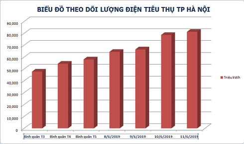 Theo thống kê hàng ngày của EVN HANOI, ngày 11/6/2019 sản lượng điện tiêu thụ trên toàn thành phố đã lên tới mức 81,256 triệu kWh (Cao nhất kể từ đầu năm 2019)
