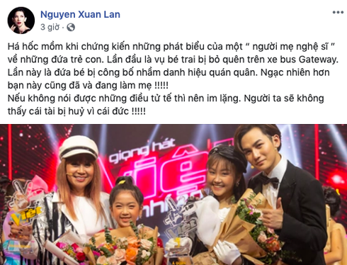 "Há hốc mồm khi chứng kiến những phát biểu của một “người mẹ nghệ sĩ ” về những đứa trẻ con. Lần đầu là vụ bé trai bị bỏ quên trên xe bus Gateway. Lần này là đứa bé bị công bố nhầm danh hiệu quán quân. Ngạc nhiên hơn bạn này cũng đã và đang làm mẹ !!!!! Nếu không nói được những điều tử tế thì nên im lặng. Người ta sẽ không thấy cái tài bị hủy vì cái đức !!!!!" - Người mẫu Xuân Lan bức xúc.