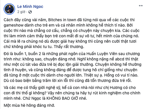 "...Những phát ngôn của Huấn Luyện Viên sau chương trình như: không sao, chuyện đáng nhớ. Nghĩ không nặng nề abcd thì thật như một cú tát vào đứa trẻ bị đọc lộn giải thưởng. Chuyện không hề thường tình ở huyện, và cũng không đáng để được tung hô chỉ giống như chuyện đã từng ở một cuộc thi dành cho người lớn. Thiệt sự ạ. Hổng có vui tí nào. Dù có bao biện bằng trăm lời xin lỗi thì cũng đã tổn thương đứa trẻ rồi.