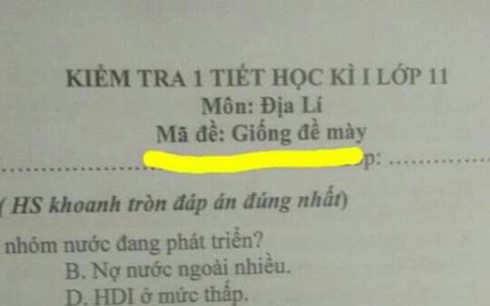 Mã đề có thể là 123, hay 321, 312 gì đó. Tuy nhiên, thời gian gần đây, các thầy cô giáo đang ngày càng có xu hướng lầy lội hơn khi đặt tên mã đề thi vô cùng hài hước. Chẳng hạn như: "Giống đề mày".