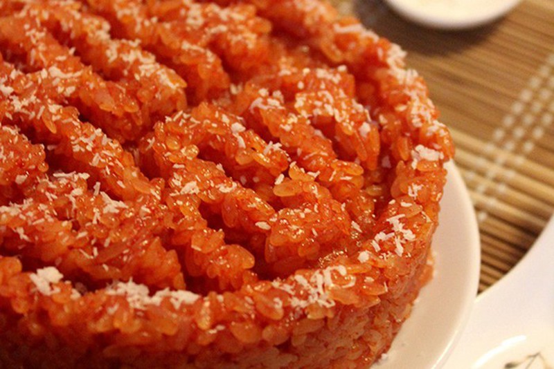 Một đĩa xôi gấc thơm dẻo, màu đỏ thắm đẹp mắt cũng là món ăn không thể thiếu trong mâm cỗ chay cúng rằm tháng Giêng.