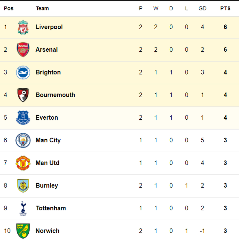 Xếp trên nhà đương kim vô địch lần lượt là Liverpool và Arsenal, cùng được 6 điểm sau hai lượt trận. Trong loạt trận trước đó, cả hai đội đều giành chiến thắng sát nút 2-1 trước Southamton và Burnley.