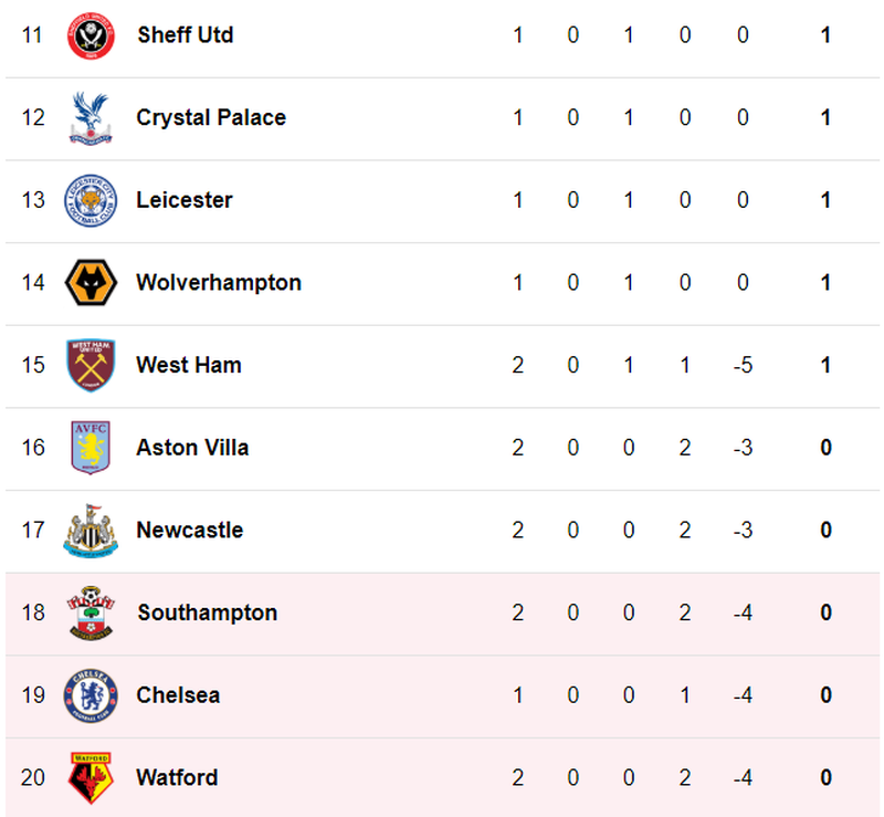 | Lịch thi đấu các trận còn lại của vòng 2: Chủ nhật, 18/8: 20h00: Sheffield United vs Crystal Palace 22h30: Chelsea vs Leicester City Thứ Ba, 20/8: 02h00: Wolverhampton Wanderers vs Manchester United |
