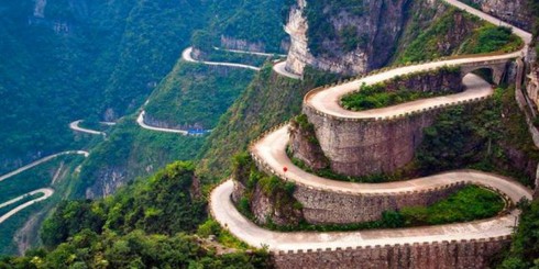 Đường ô tô lên Thiên Môn Sơn với hàng trăm khúc cua tay áo làm mê đắm lòng người. |