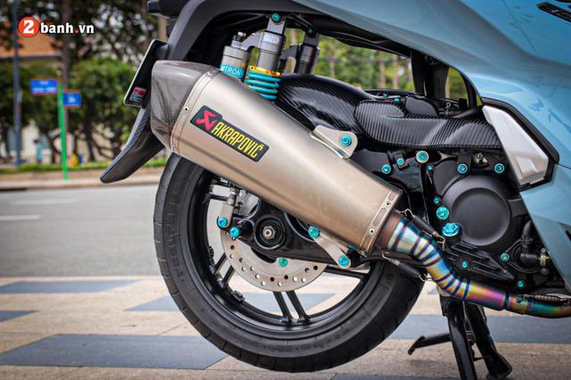 Để đem lại tiếng gào thét rất mạnh mẽ và giàu cảm xúc, cũng như gia tăng công suất máy, chủ nhân đã sử dụng ống xả Akrapovic Titan mẫu đùi gà kết hợp cùng cổ pô Titan cực đẹp trong từng khúc nối nghệ thuật. Ưu điểm mà cổ pô Titanium mang lại là trọng lượng cực nhẹ và âm thanh sẽ thay đổi khi nhiệt độ tăng.