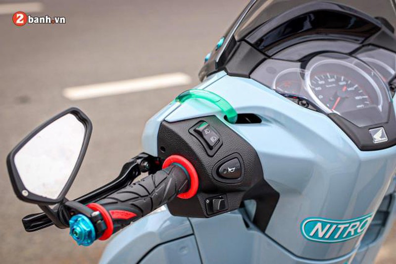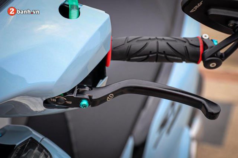 Ngoài ra, tay cấu tạo từ nhôm CNC sắc sảo còn được tích hợp thêm tính năng là tăng chỉnh khoảng cách theo kích thước tay của mỗi người & chống gãy khi va quẹt. Cánh trái cũng tương tự với cùm Brembo RCS 16, toàn bộ chi tiết ở phần đầu được cố định bằng ốc Proti màu xanh lục bảo. 2 phía tay lái lấp đầy khoảng trống với bao tay Spider kết hợp cùng kính gù CRG.