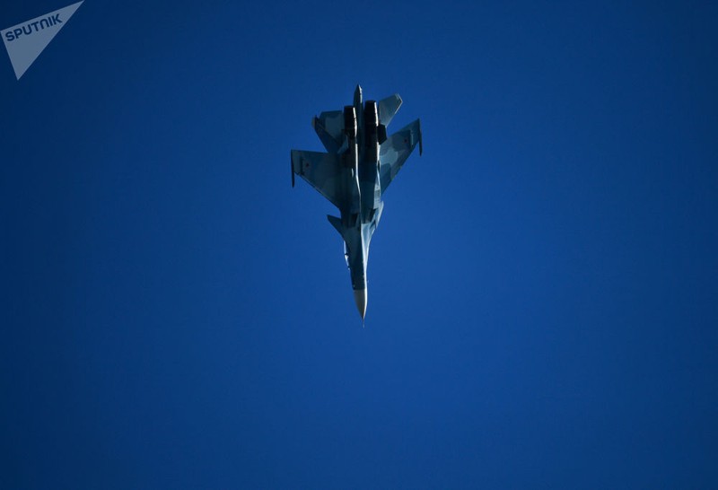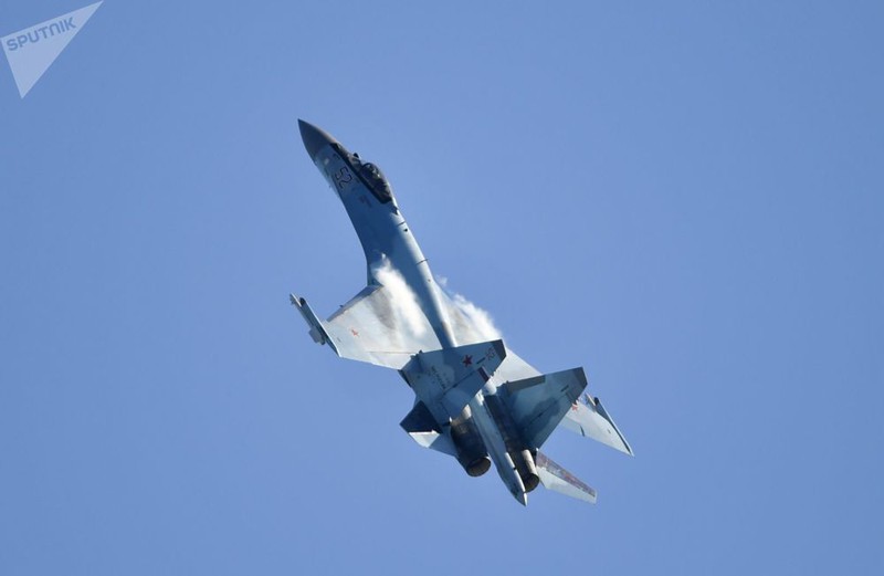 Tiêm kích đa năng Su-35 của Nga trình diễn tại triển lãm. |