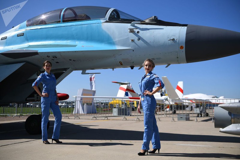Các nữ tiếp viên tạo dáng bên chiến đấu cơ đa nhiệm Mikoyan MiG-35. |