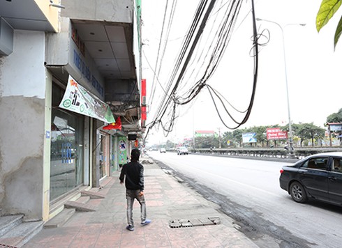 Theo quan sát của chúng tôi, dọc các tuyến phố trung tâm hệ thống dây này vô cùng chằng chịt, võng hẳn xuống ngang mặt tiền nhà dân, gây nguy hiểm các người đi bộ trên vỉa hè.