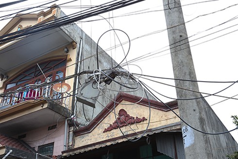 | Dây viễn thông, cáp truyền hình chắn ngang mặt tiền các hộ dân rất mất mỹ quan. |