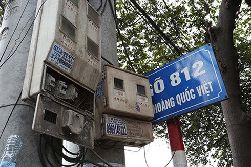| Công tơ điện bị mở tung và che cả biển tên đường tên phố. |
