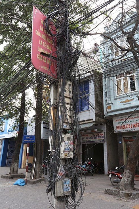 | Trên đường Trần Phú la liệt các cột dây "cổ thụ". |