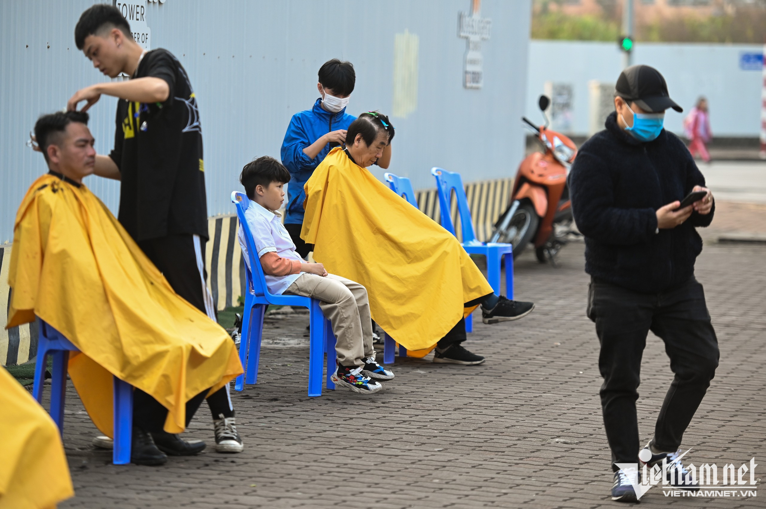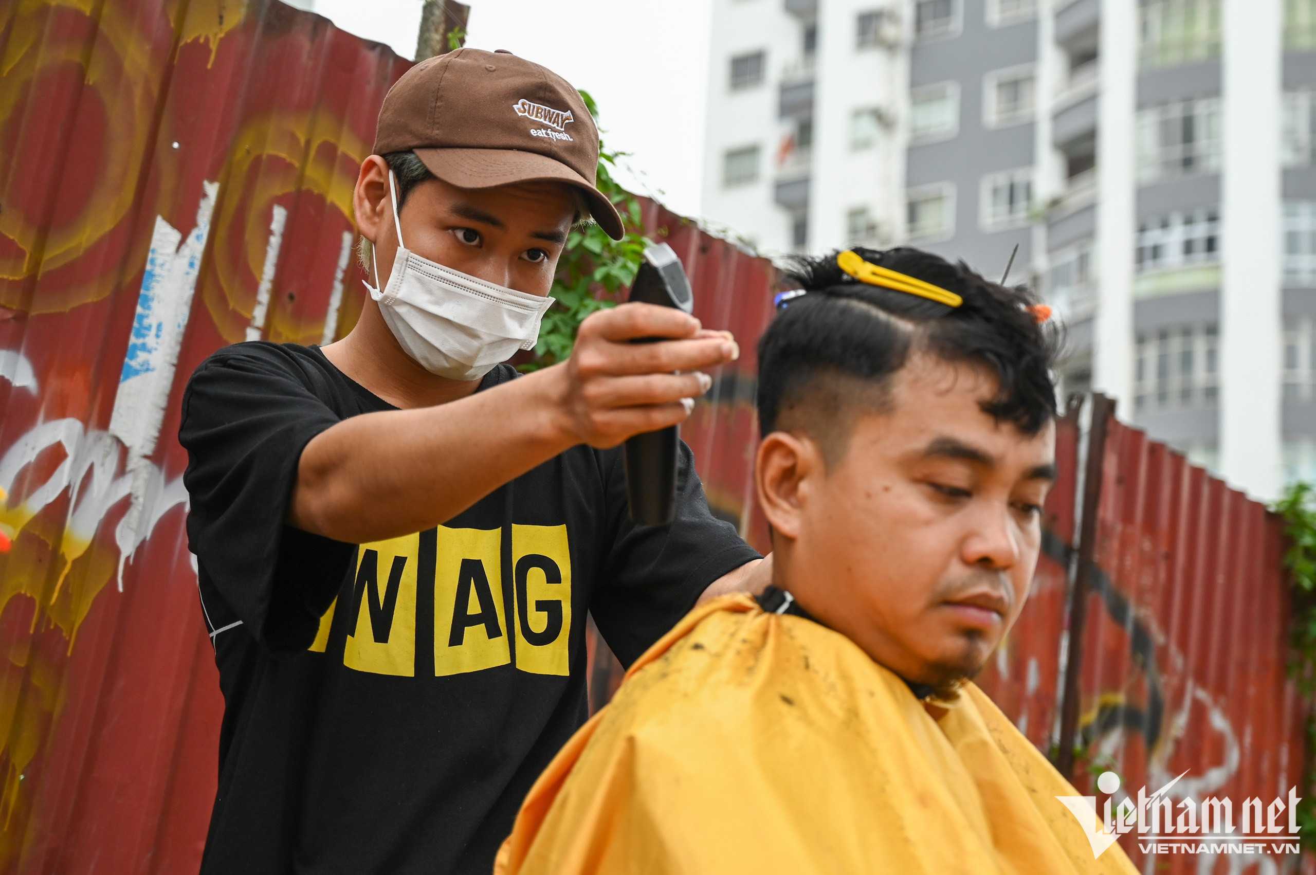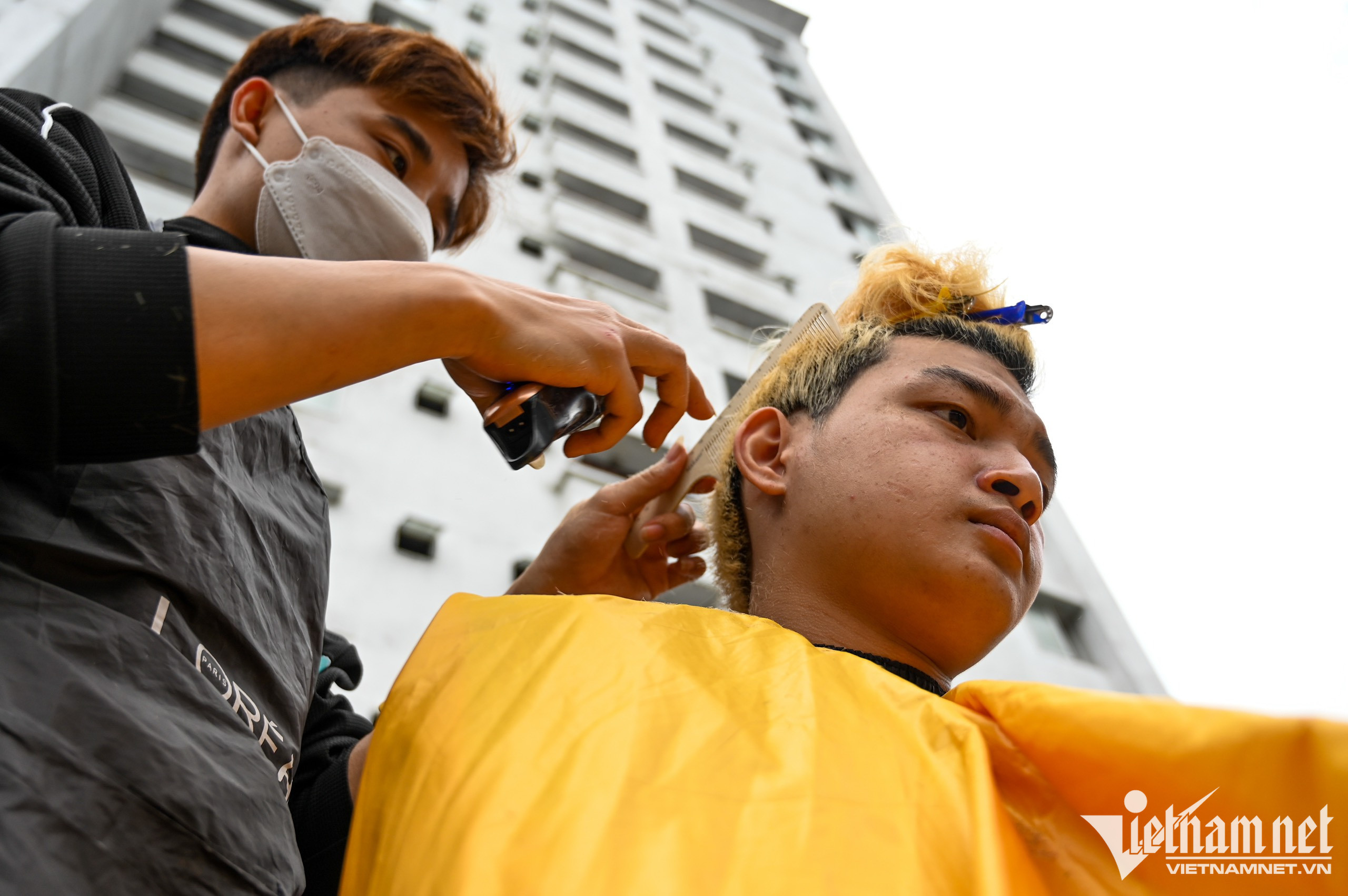 Tại một điểm cắt tóc khác trên phố Trần Thái Tông (quận Cầu Giấy), các anh thợ học việc cắt tóc không ngơi tay. Khách đến liên tục từ sáng tới chiều muộn.