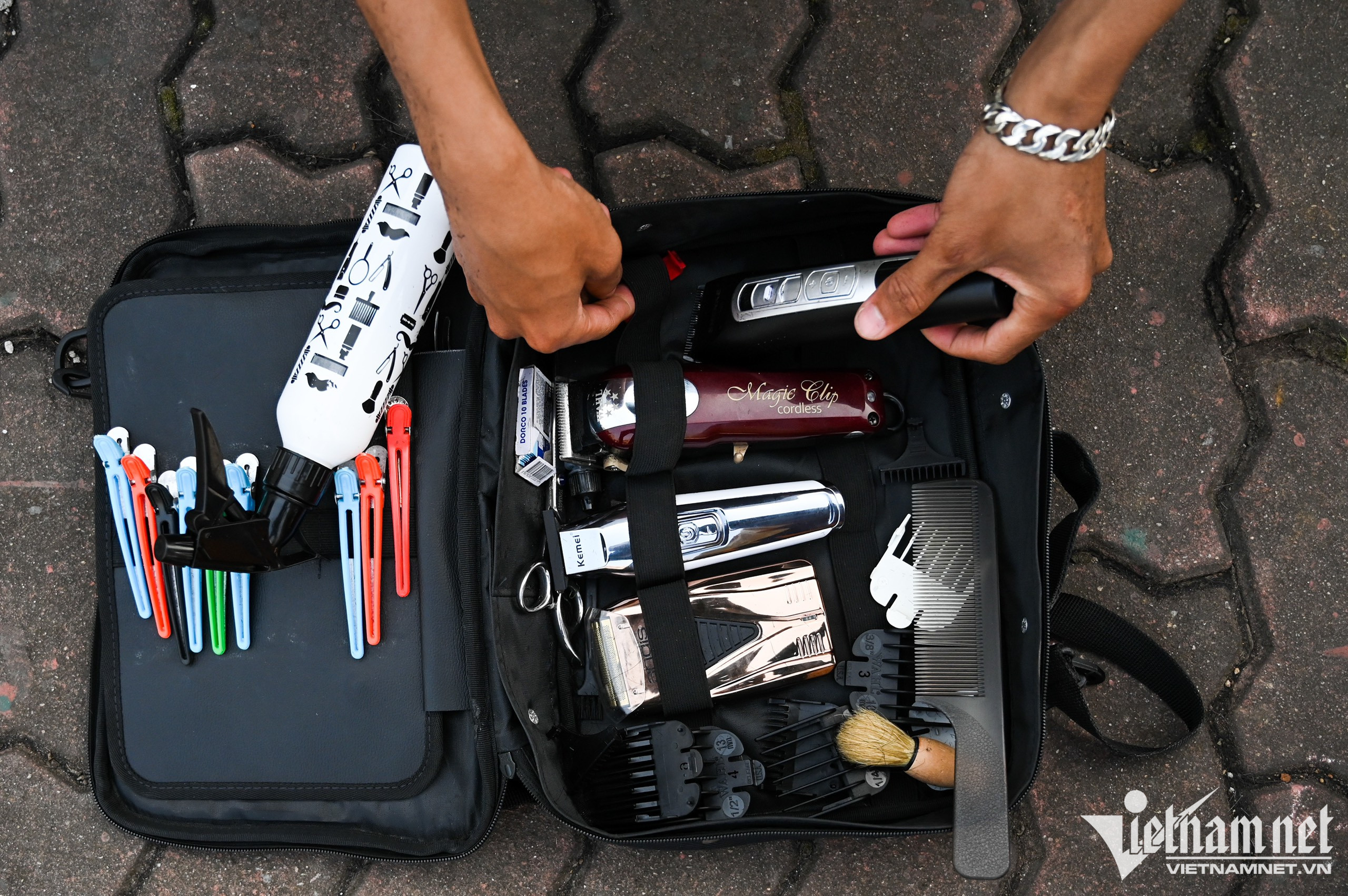 Tại điểm cắt tóc vỉa hè phố Trung Kính, một nhóm học viên hành nghề thợ cạo, hoạt động từ 9h đến 17h. Trung bình, một ngày họ nhận khoảng 40-60 đầu. Khách chủ yếu là nhân viên giao hàng hoặc công nhân, giới lao động tự do.