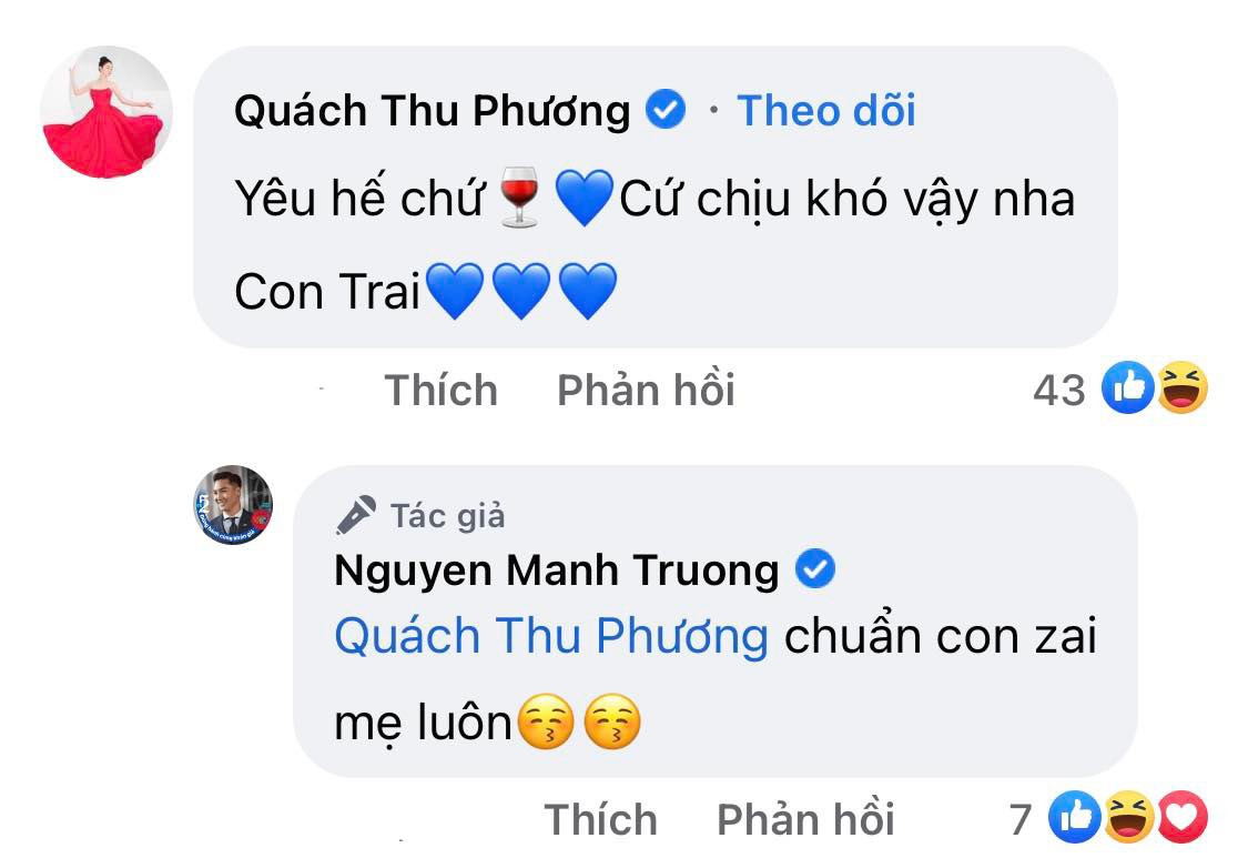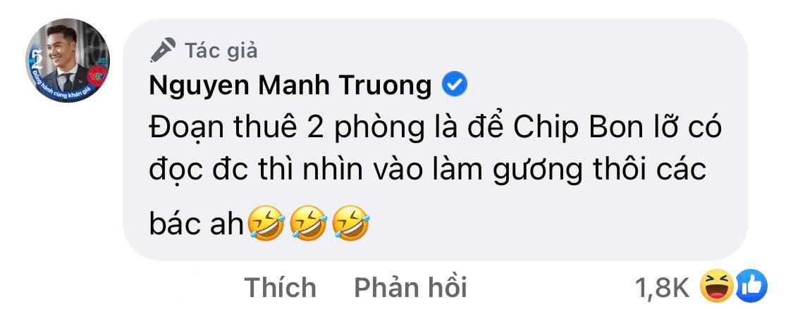 Đáng chú ý, tại phần bình luận, nam diễn viên còn giải thích thêm: “Đoạn thuê 2 phòng là để Chip, Bon lỡ có đọc được thì nhìn vào làm gương thôi các bác ạ”. Hình tượng "trai ngoan” này cùng sự tinh tế của Mạnh Trường khiến cộng đồng mạng không khỏi thích thú.