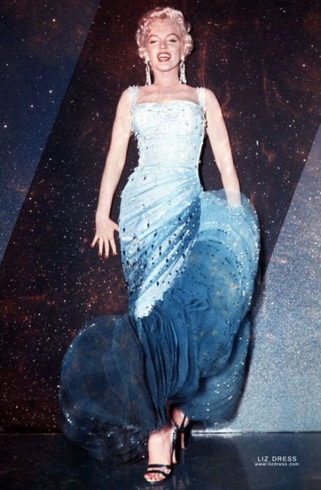 Năm 1954, tại phim trường “There No Business Like Show Business”, Marilyn Monroe nổi bật trong chiếc đầm cổ vuông đính hạt cườm mang hai tông màu với phần đuôi váy xếp tầng.