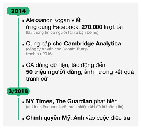 Tiếp đến năm 2013, ứng dựng Kogan ra đời, thu thập dữ liệu của hàng chục triệu người dùng. Năm 2014, Facebook mới bắt đầu ra chính sách về sử dụng dữ liệu người dùng cho bên thứ ba, và có chỉ hiệu lực với những ứng dụng ra đời sau đó.