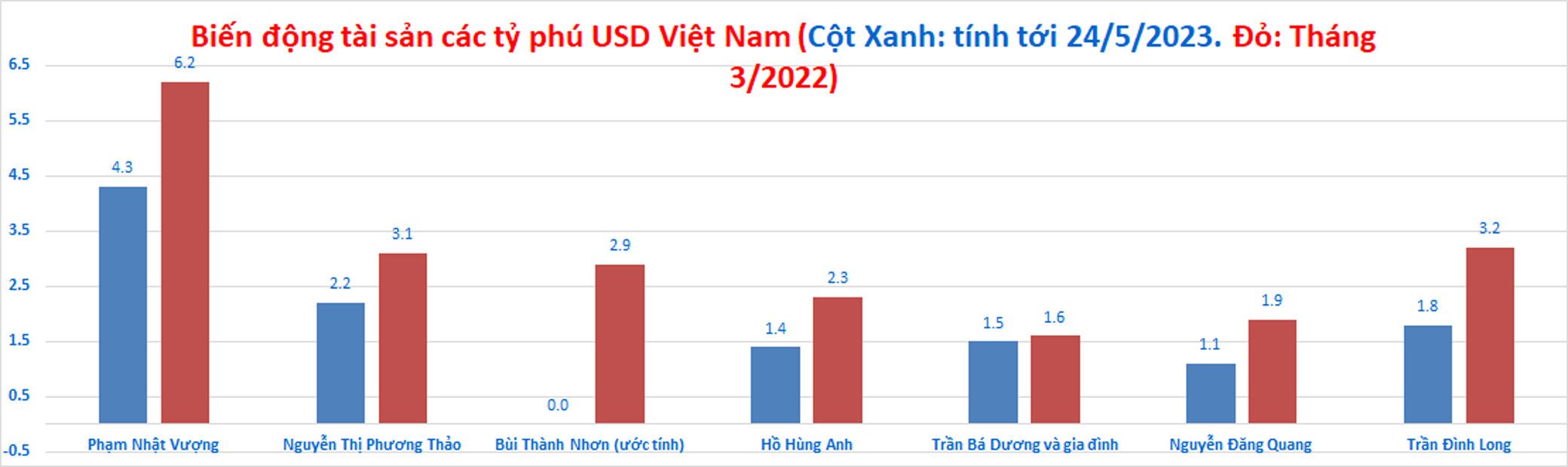 Thống kê cho thấy, tính đến ngày 24/5, cả 6 tỷ phú USD Việt có tổng tài sản khoảng 12,3 tỷ USD, thấp hơn so với mức 18,3 tỷ USD ghi nhận trong bảng xếp hạng hồi tháng 3/2022 (không tính 2,9 tỷ USD khi đó của ông Bùi Thành Nhơn).