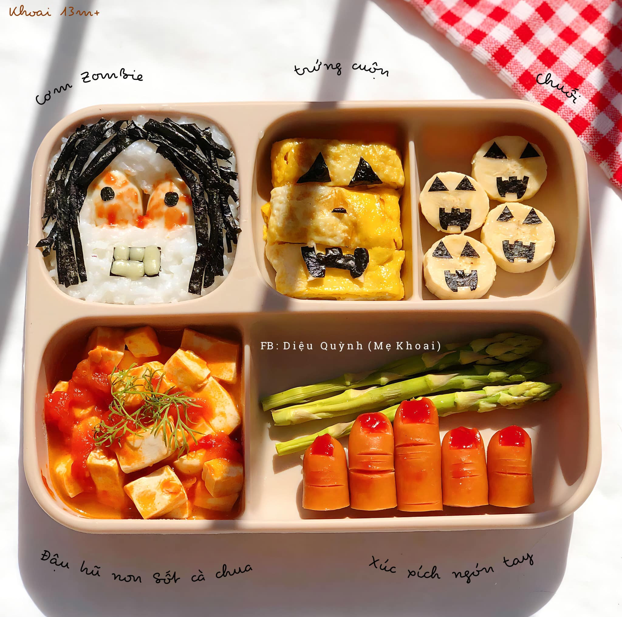 Chị Diệu Quỳnh (25 tuổi, hiện đang sống tại Nhật Bản) có 1 cậu con trai tên Gia Khánh (tên ở nhà là Khoai, vừa tròn 1 tuổi). Những ngày gần đến lễ hội Halloween, chị Quỳnh đã biến tấu một chút để làm ra nhiều hộp cơm vô cùng đặc biệt, hấp dẫn cho con.