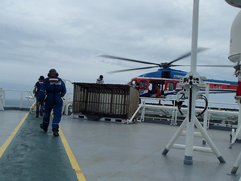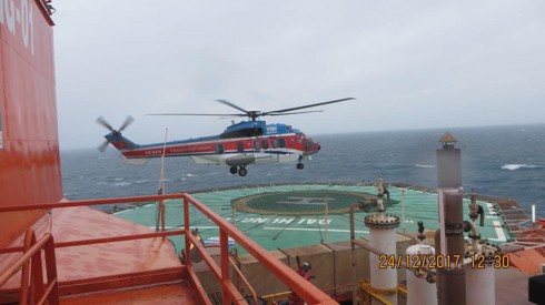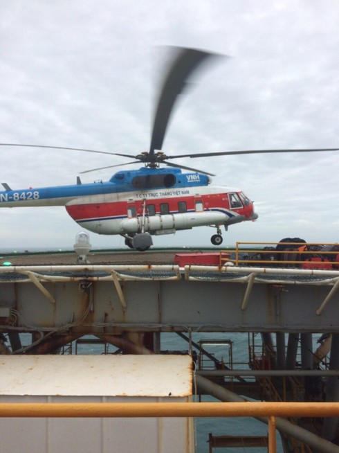Các kỹ sư, cán bộ nhà giàn Đại Hùng 01 chuẩn bị lên máy bay. Ảnh: PVN. |
