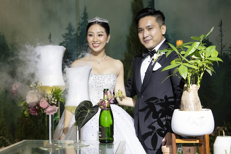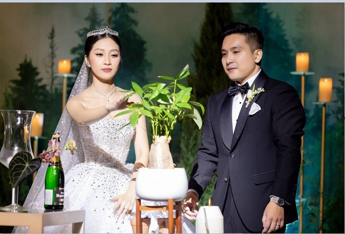 Đặc biệt, trong tiệc cưới của MC Liêu Hà Trinh, cô và chú rể doanh nhân không thực hiện nghi thức cắt bánh như thông thường mà lựa chọn trồng cây xanh với mong muốn hôn nhân được vun đắp và tươi tốt từng ngày.