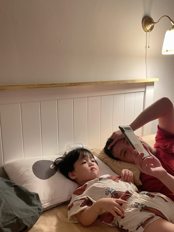 Trong ảnh, cậu bé đang nằm trên giường cùng bố và chăm chú nhìn vào chiếc điện thoại trước mặt. Có lẽ, vì đang theo dõi clip của bố nên bé Hi vô cùng tập trung, thậm chí gương mặt rất “nghiêm túc”.