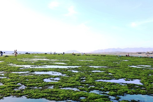 Theo người dân địa phương, thời điểm để chiêm ngưỡng "cánh đồng" rong biển vào khoảng ngày 14 - 20 Âm lịch. Lúc này, thủy triều xuống sâu làm lộ rõ những mảng đá san hô phủ đầy rong biển trải dài xanh biếc. |