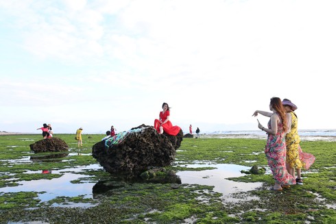 Để chiêm ngưỡng và check-in tại đây, du khách phải có mặt vào khoảng 5h-9h vào buổi sáng và từ 16h- 18h vào buổi chiều (thời gian có thể xê dịch tùy thời tiết). Thời điểm "cánh đồng" rong biểu hiện rõ nhất là khi thủy triều xuống. |