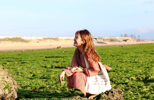 Bạn trẻ Cóng Thị Bích, du khách từ thủ đô Hà Nội tìm đến đây “check-in”. “Vừa đến Ninh Thuận, nghe giới thiệu về cánh đồng rong biển, tìm đến tôi ngỡ ngàng bởi vẻ đẹp hoang sơ, một màu xanh phủ kín tạo cảm giác nhẹ nhàng theo từng đợt sóng biển trắng xóa”, Bích chia sẻ. |