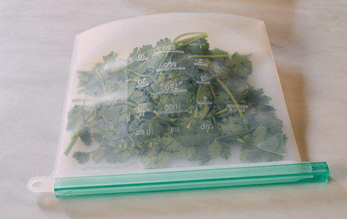 - Cho rau vào túi cấp đông (tốt nhất vẫn là loại túi có thể tái sử dụng). Dùng tay ép cho không khí trong túi ra hết ngoài, khóa mép túi lại. Sau đó cất túi vào trong ngăn đá tủ lạnh. Khi nào ăn, bạn đừng đem rã đông rau mà chỉ cần cho trực tiếp vào món ăn mình thích để tránh nát rau.