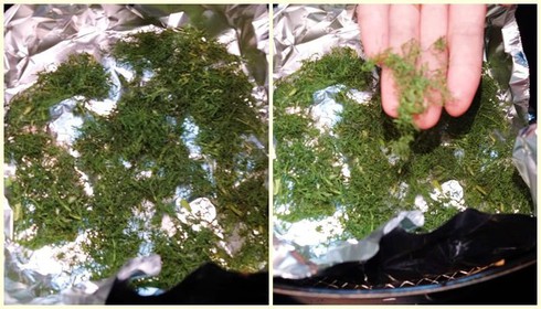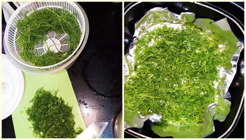 Lưu ý: trong khi đang sấy không mở nồi ra xem vì rau sẽ bay tứ tung. Cách này áp ụng được với mùi ta nhưng bị nát hơn so với thì là.