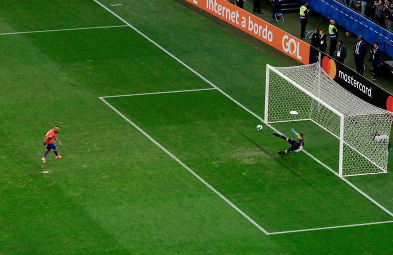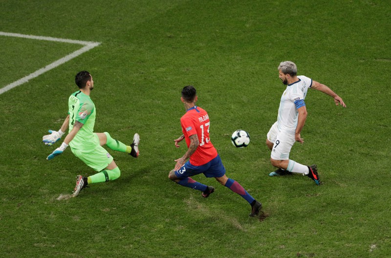 Không vào: Nhận đường chọc khe tinh tế của đồng đội, Aguero tung cú sút về góc xa nhưng bóng đi chệch cột dọc khung thành Chile.
