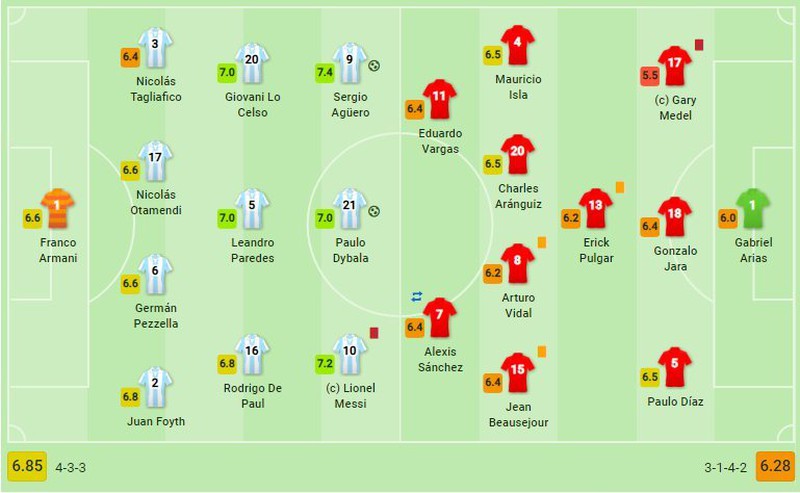 THẺ ĐỎ: Sau một pha tranh chấp, Messi và Medel lao vào nhau xô xát. Trọng tài người Paraguay Mario Diaz de Vivar quyết định rút thẻ đỏ đuổi cả cầu thủ và giữ nguyên quyết định sau khi tham khảo VAR.