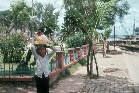 Hai phụ nữ bán mía ghim bên bờ sông Sài Gòn. Theo sự đổi thay của thời cuộc, các quầy mía ghim dần vắng bóng, và ngày nay đã "tuyệt tích" trên đường phố Sài Gòn. Ảnh: Thomas W. Johnson. |
