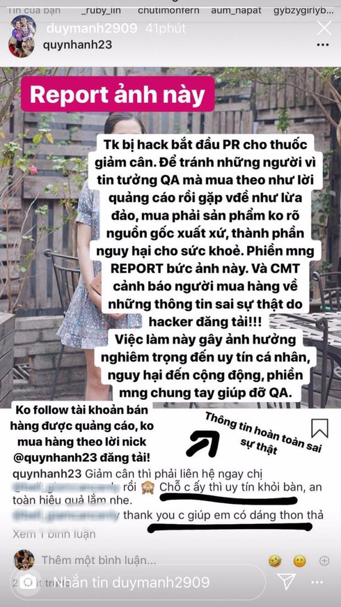 Mới đây, Duy Mạnh liên tục đăng tải thông báo trên trang cá nhân về "Công chúa béo" Quỳnh Anh – người yêu của cầu thủ: "Chào mọi người, hiện tại Instagram quynhanh23 và facebook Nguyễn Quỳnh Anh đã không còn là của Quỳnh Anh nữa. Quỳnh Anh bị hack rồi nhé. Hiện tại, hacker đã viết thêm ở phần tiểu sử "nhận PR". Toàn bộ tin nhắn, bài đăng, quyền kiểm soát tài khoản không còn là của QA nữa… Mọi người share để cảnh báo giúp mình ạ!". |
