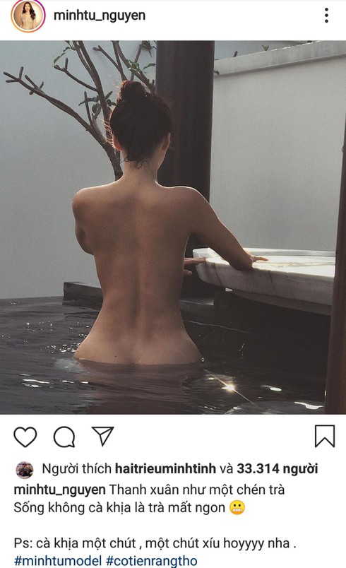 Mới đây, trên trang instagram cá nhân của mình, siêu mẫu Minh Tú khiến khán giả “mất ngủ” khi đăng bức ảnh nude từ phía sau lưng, khoe trọn thân hình bốc lửa với bờ lưng trần gợi cảm và vòng 3 “lấp ló” kèm dòng trạng thái: “Thanh xuân như một chén trà, sống không cà khịa là trà mất ngon”. |