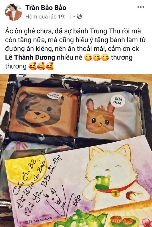 Cách đây ít giờ, khán giả tỏ ra phấn khích trước tình cảm của cặp đôi BB Trần và Ngô Kiến Huy dành cho nhau. Cụ thể, trên trang cá nhân, nam diễn viên hài BB Trần chia sẻ bức ảnh chụp lại món quà được đàn anh gửi tặng, biết BB đang giảm cân, chàng Bắp rất tâm lý khi gửi tặng hộp bánh trung thu không đường. Đã vậy, anh chàng còn gửi lời chúc “mùi mẫn” tới BB: “Cám ơn BB đã hỗ trợ cho Bắp. Mãi yêu BB xinh đẹp". |