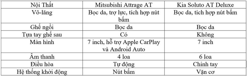 Mitsubishi Attrage AT tiện dụng hơn khi hệ thống điều hòa tự động và có thêm tính năng khởi động bằng nút bấm. Trong khi đó, Soluto AT Deluxe có hệ thống âm thanh 6 loa, nhiều hơn so với 4 loa của đối thủ, giúp trải nghiệm giải trí tốt hơn.