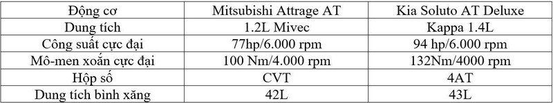 Có thể thấy, sự chênh lệch về giá bán của Mitsubishi Attrage CVT 2020 và Kia Soluto AT Deluxe là không đáng kể. Xét về thiết kế, đẹp xấu còn tùy vào thẩm mỹ của người dùng, khi Mitsubishi Attrage trẻ trung, hiện đại hơn nhờ ngôn ngữ thiết kế mới, Kia Soluto lại mang dáng vẻ cứng cáp, thể thao. Nhìn chung, đây đều là 2 mẫu xe thích hợp cho những người mua xe lần đầu hoặc mua để sử dụng cho mục đích kinh doanh dịch vụ. Nếu như Mitsubishi Attrage vượt trội hơn hẳn về trang bị tiện nghi và công nghệ hiện đại, thì Kia Soluto lại sở hữu khối động cơ mạnh mẽ hơn rất nhiều.