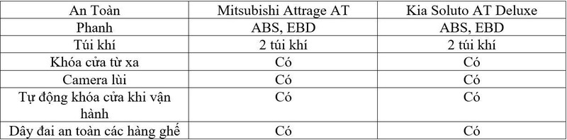 Về trang bị an toàn, Mitsubishi Attrage CVT 2020 và Kia Soluto AT Deluxe gần như tương đồng với nhau khi đều sở hữu những tính năng cấn thiếu đảm bảo an toàn chủ động và thụ động.