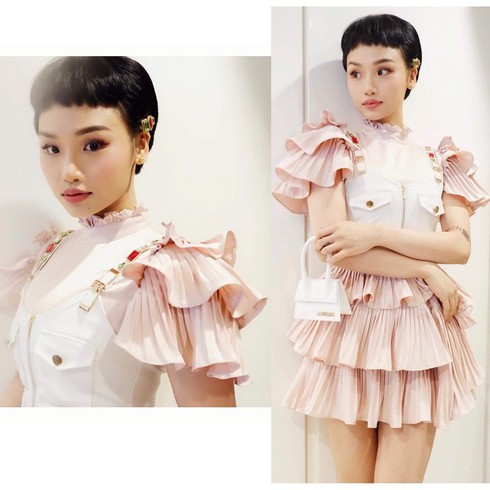 Miu Lê điệu đà trong bộ váy xếp ly bèo nhún màu hồng pastel |