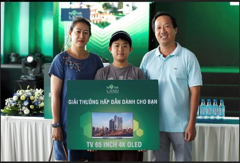 Gia đình anh Lê Quốc Trí hào hứng với các sản phẩm BĐS du lịch nghỉ dưỡng giải trí “tất cả trong một” và cũng là khách hàng may mắn nhận được phần thưởng trong chương trình rút thăm may mắn. |