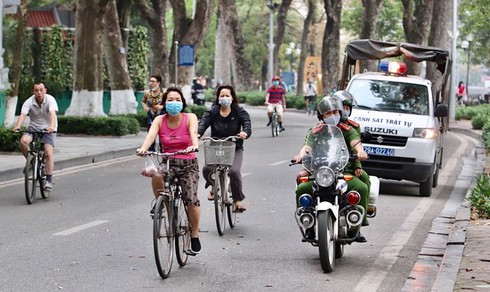 Sáng 28/3, Đội Cảnh sát giao thông trật tự, Công an quận Hoàn Kiếm phối hợp cùng Mặt trận Tổ quốc, các đoàn thể các phường quanh khu vực Hồ Gươm, quận Hoàn Kiếm (Hà Nội) đã tổ chức tuyên truyền, vận động người dân đi tập thể dục nghiêm túc đeo khẩu trang và không tụ tập đông người nơi công cộng.