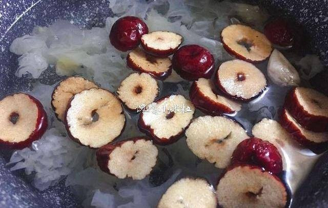 Bước 3: Cho một lượng nước vừa đủ vào nồi, cho nấm tuyết và táo đỏ vào đun, đun sôi trên lửa lớn, sau đó chuyển sang lửa nhỏ và nấu trong 1 giờ.