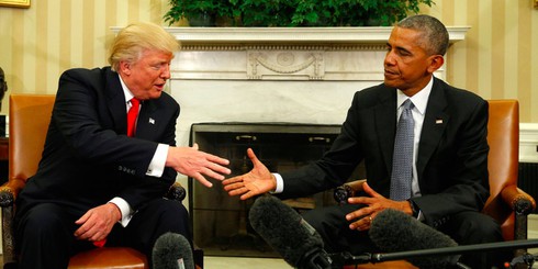 Tổng thống Donald Trump bắt tay cựu Tổng thống Barack Obama trong Phòng Bầu dục. |